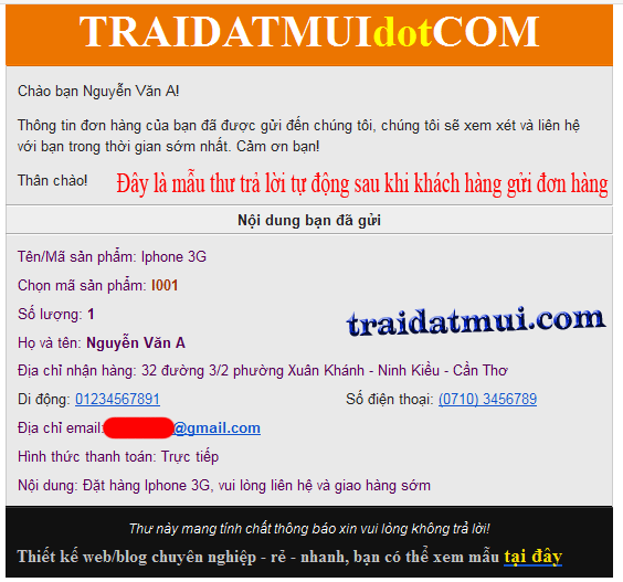 Ngược lại nếu khách hàng có địa chỉ email thì họ sẽ nhận được thư thông báo về đơn hàng do bên bạn thiết lập có dạng như sau:
